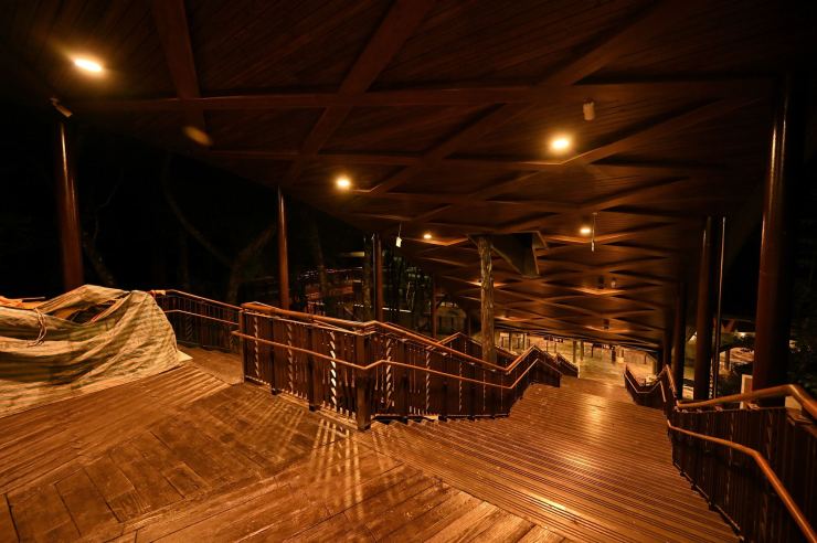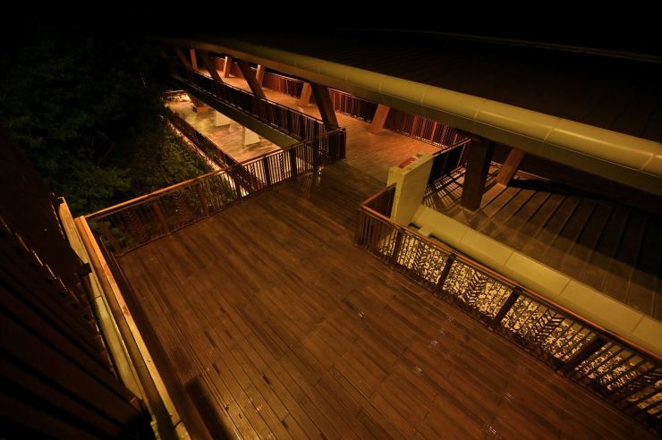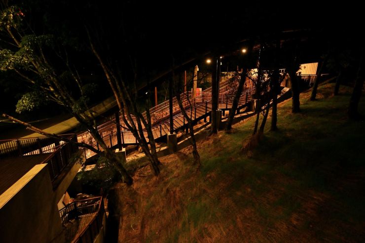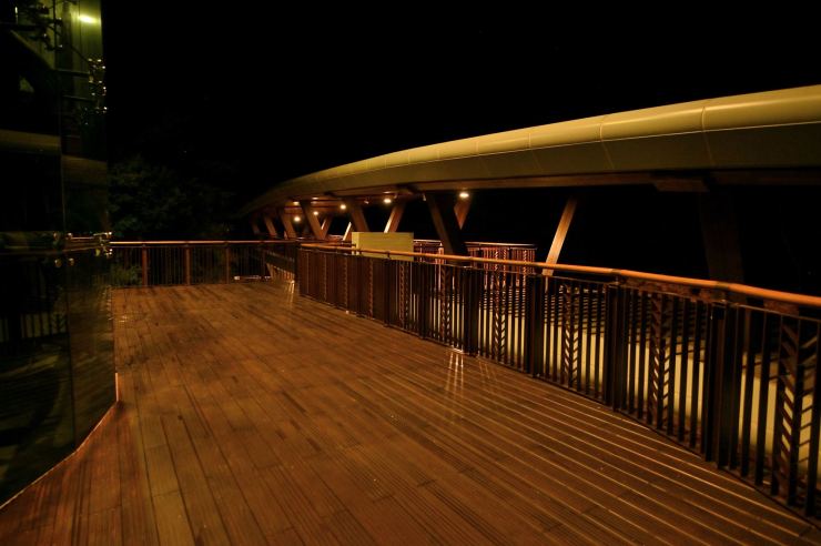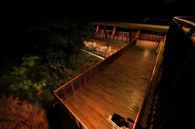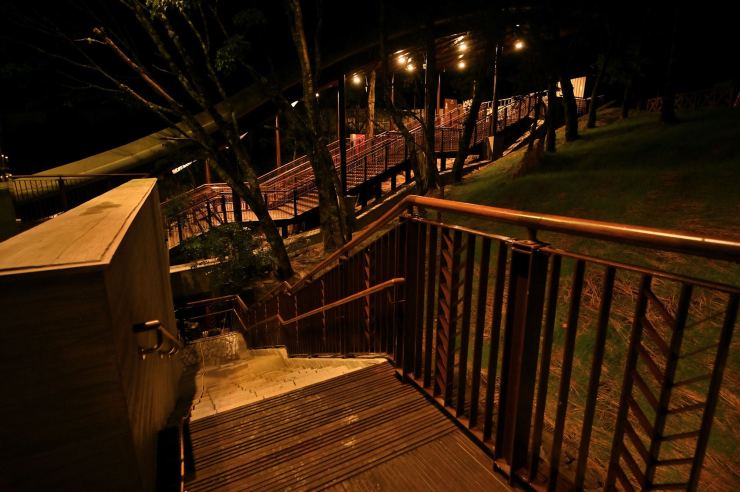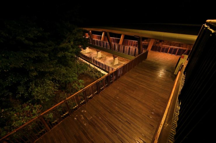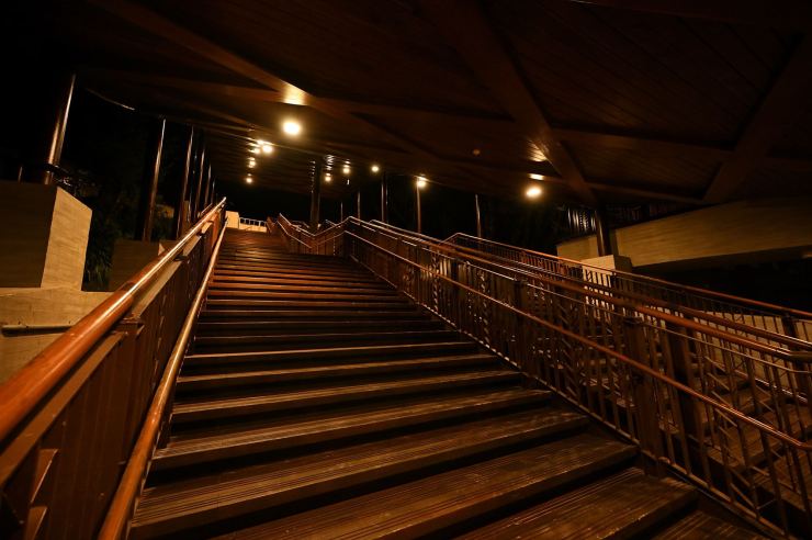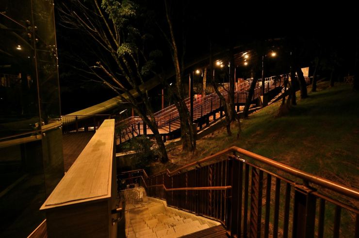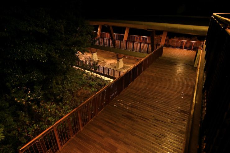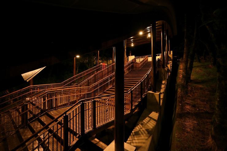 ※動線照明:以水平前拋兩側超廣角光學技術,使光線僅照亮月台、樓梯等動線區域,不外溢至周遭樹林,燈具水平投光輔以柔光濾鏡使視覺眩光降至GR10以下,創造明亮低眩光動線照明。