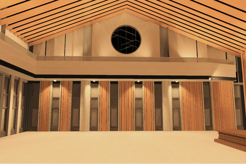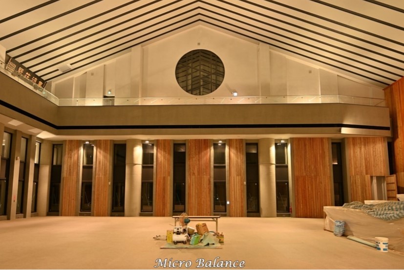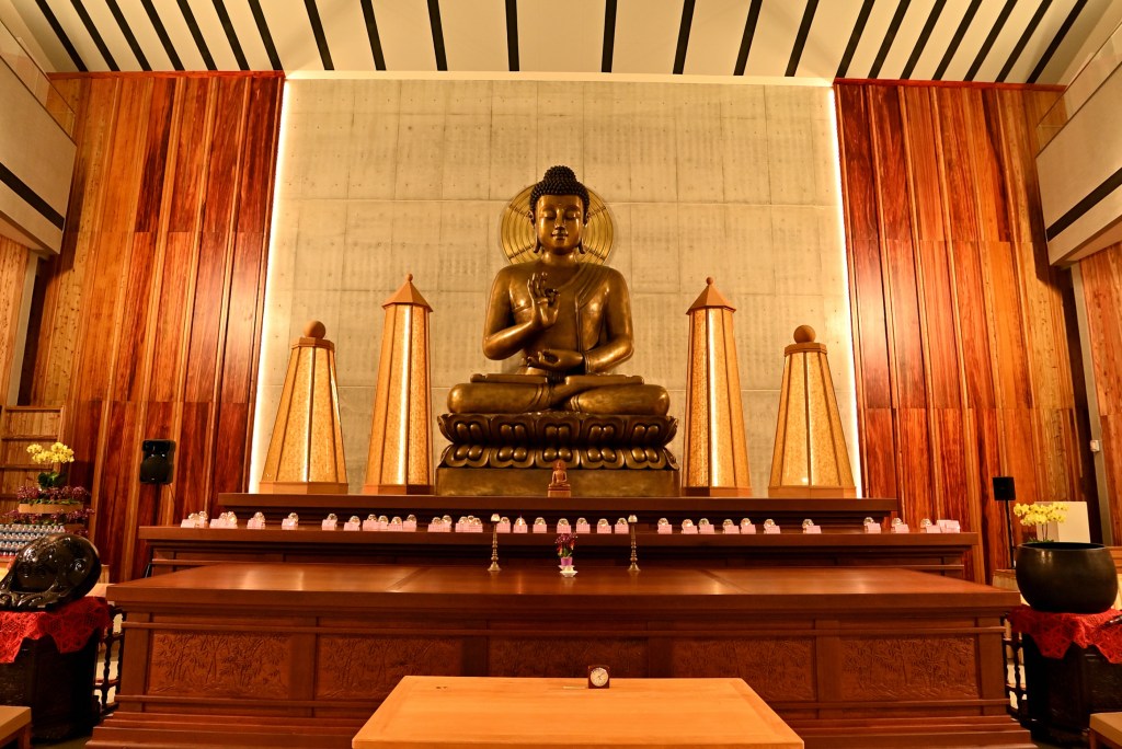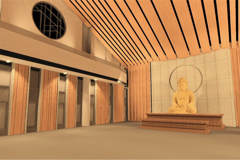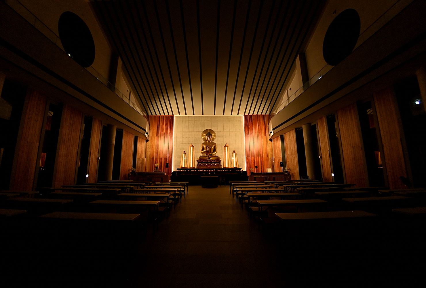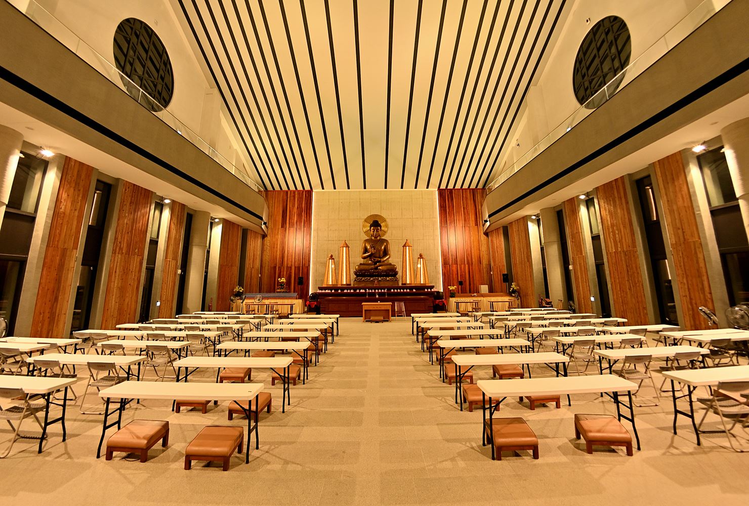 照明強調大殿的莊嚴與寧靜,燈具分布於兩側,中央光線均勻且無眩光,整體設計兼顧實用與視覺舒適,營造出和諧的光環境。