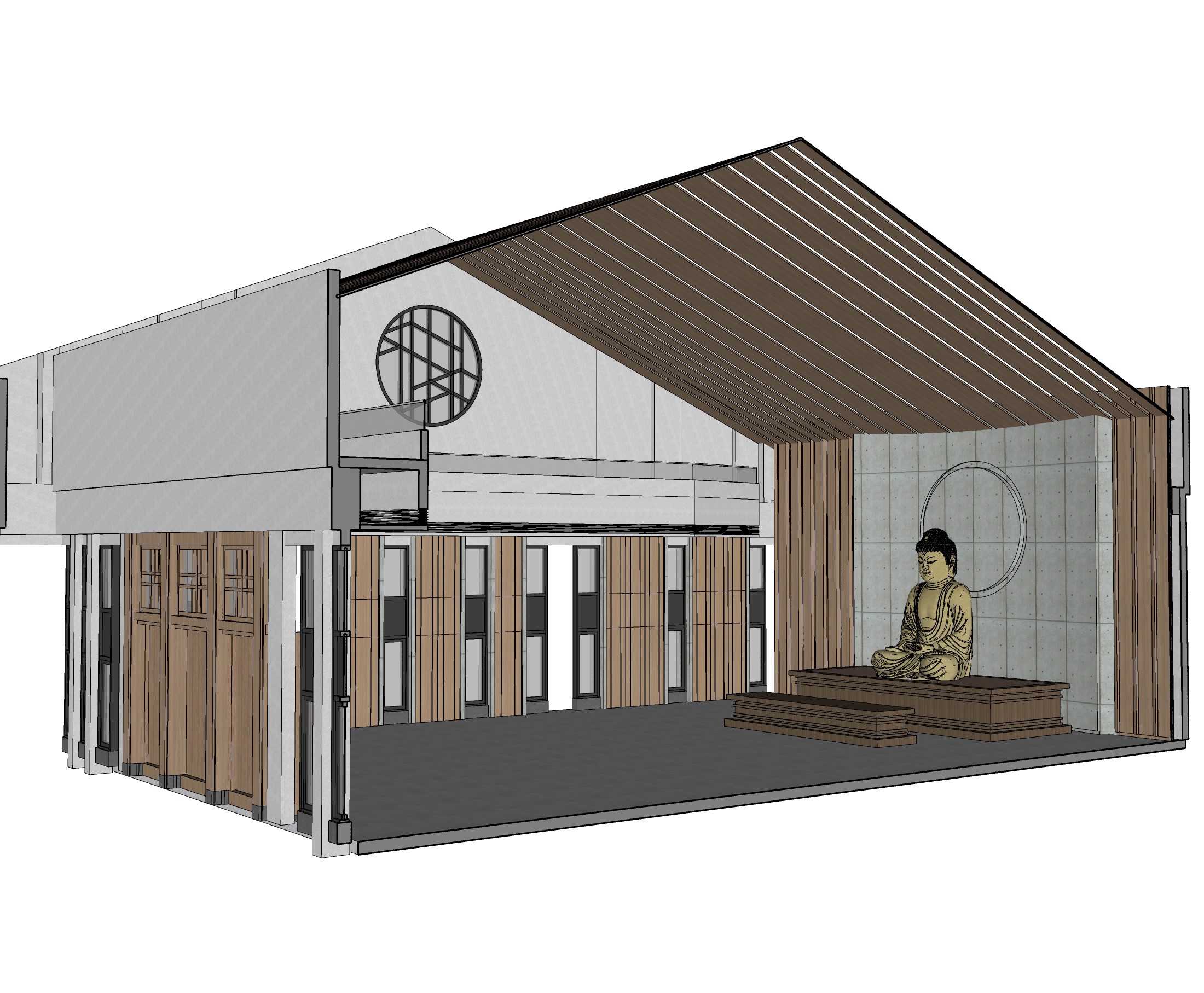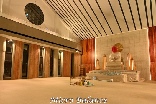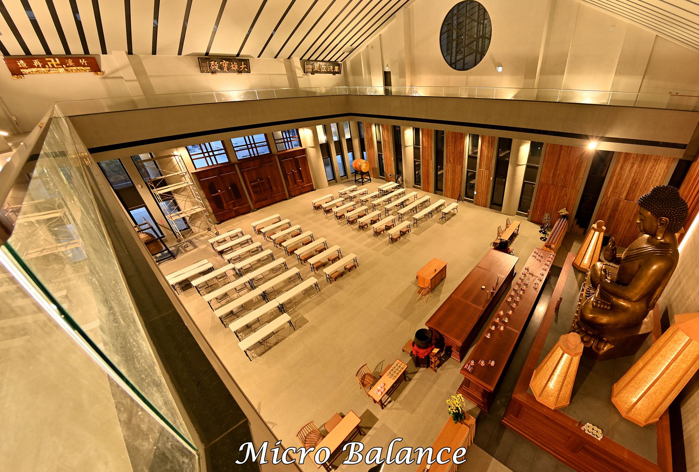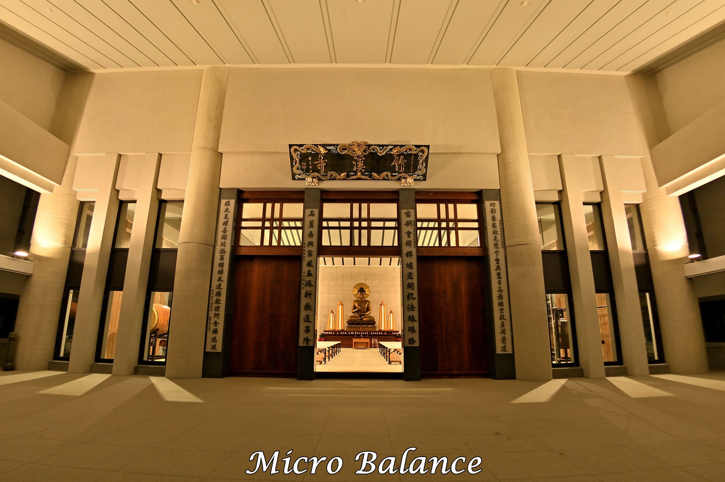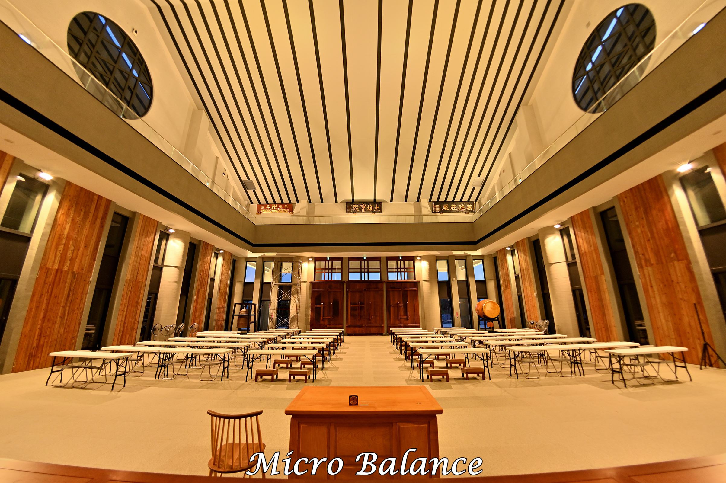 照明強調大殿的莊嚴與寧靜,燈具分布於兩側,中央光線均勻且無眩光,整體設計兼顧實用與視覺舒適,營造出和諧的光環境。